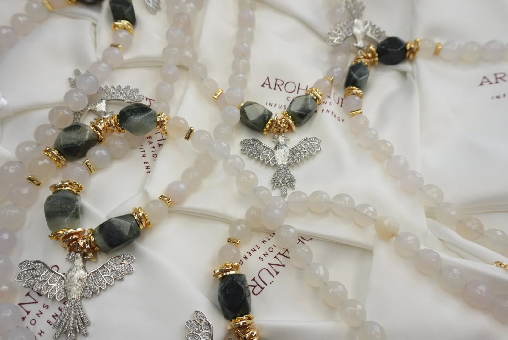 Step into your power with our Agate & Milky Quartz Phoenix Necklace — a handmade talisman honouring the sacred masculine through grounded clarity, transformation, and energetic strength. This piece is infused with sound and symbolism to support deep awareness, purpose, and personal evolution.